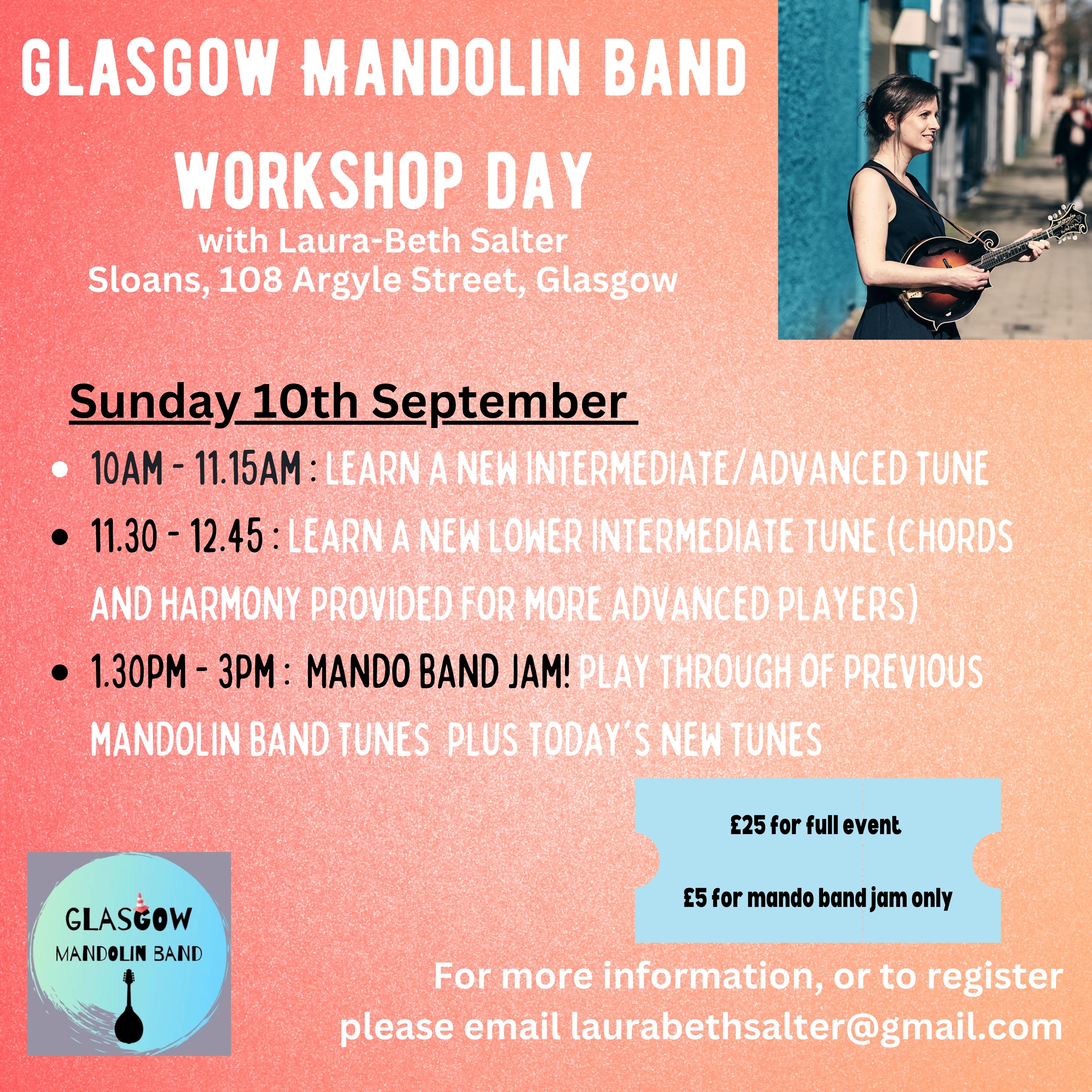 10th September 2023, 10am – 3pm : Glasgow Mandolin Band Workshop Day at Sloans Bar, Glasgow. This is aimed at teaching some new tunes for the band, but anyone is welcome to come and join us. ( Please note – due to the hire fee of the venue, this is event is dependent on numbers. Please let me know by the 27th of August of you plan on attending. Thanks!)